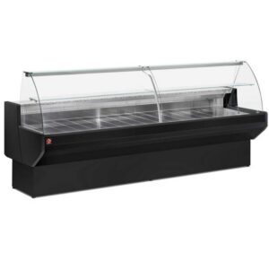 Il s’agit d’une vitrine réfrigérée avec réserve réfrigérée en inox et vitrage bombé en verre trempé.